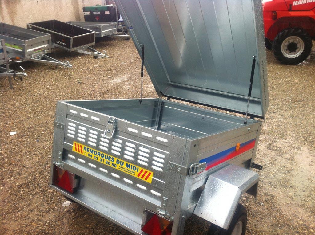 Remorques pour 1 ou 2 chiens 1 compartiment, capot à ouverture assistée par 2 verins hydrauliques. Fermeture avec une serrure à clefs. Dimensions : 1.23 x 1 x0.55 Essieu : 450 kg, PTC : 350 kg, Roues : 450 x 10.