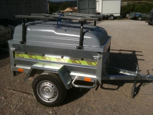 R256 : 2.42 m x 1.35 m x 0.40 m. Remorque basculante, flèche en V, 4 ridelles démontables (pour utilisation plateau) roues 155 x 13, 2 essieux 750 kg
